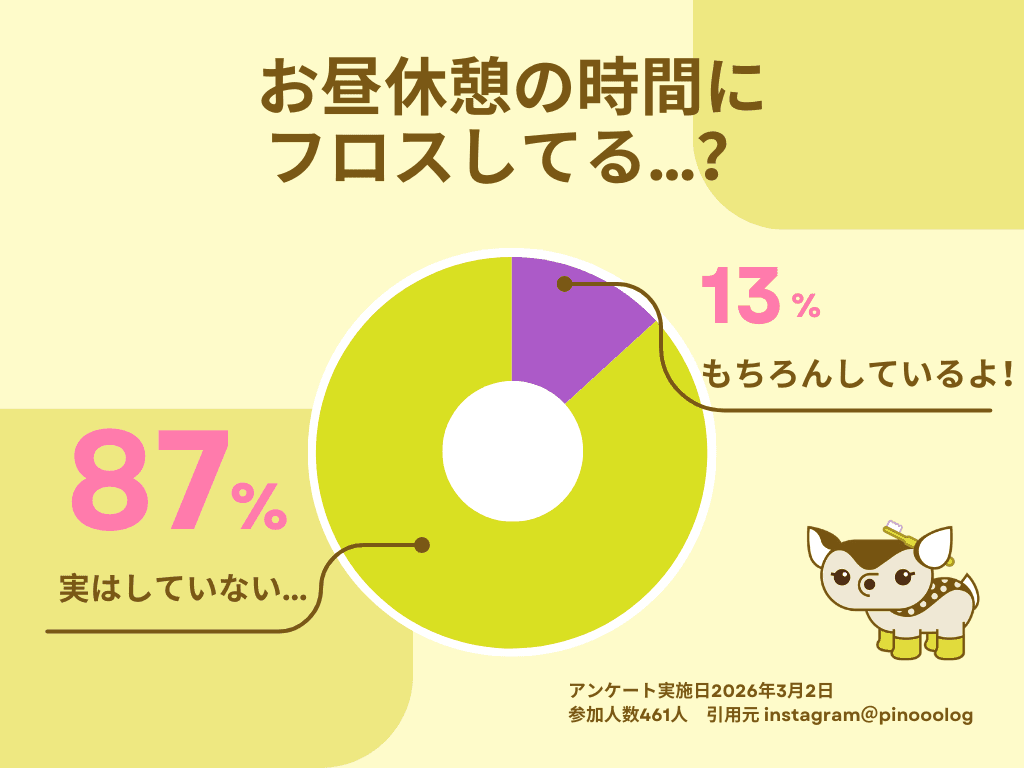今回は「お昼休憩の時間にフロスしてる…?」というアンケート結果をもとに、歯科衛生士さんのお昼休憩のリアルを整理してみます🌷