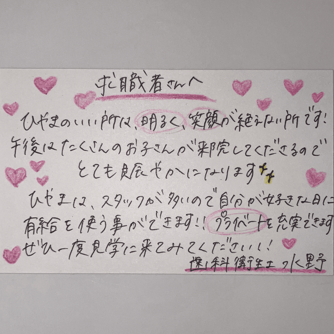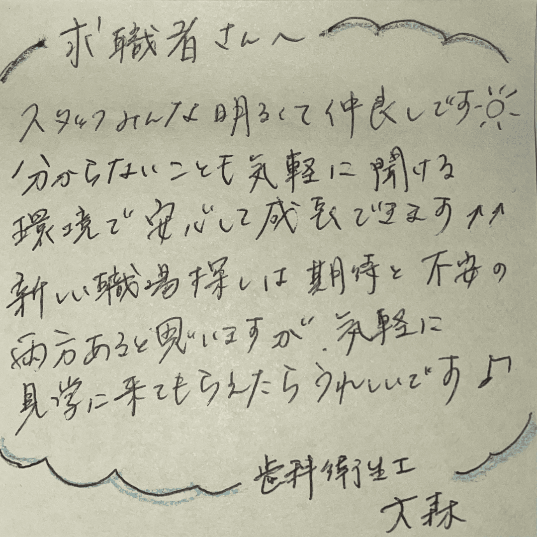 当院はチームワークを大切にしており、診療は常に活気があります。スタッフ同士の連携がとても良く、助け合いながら業務を進めています。職種を問わず相談しやすい雰囲気があり、明るく前向きに働ける環境です。