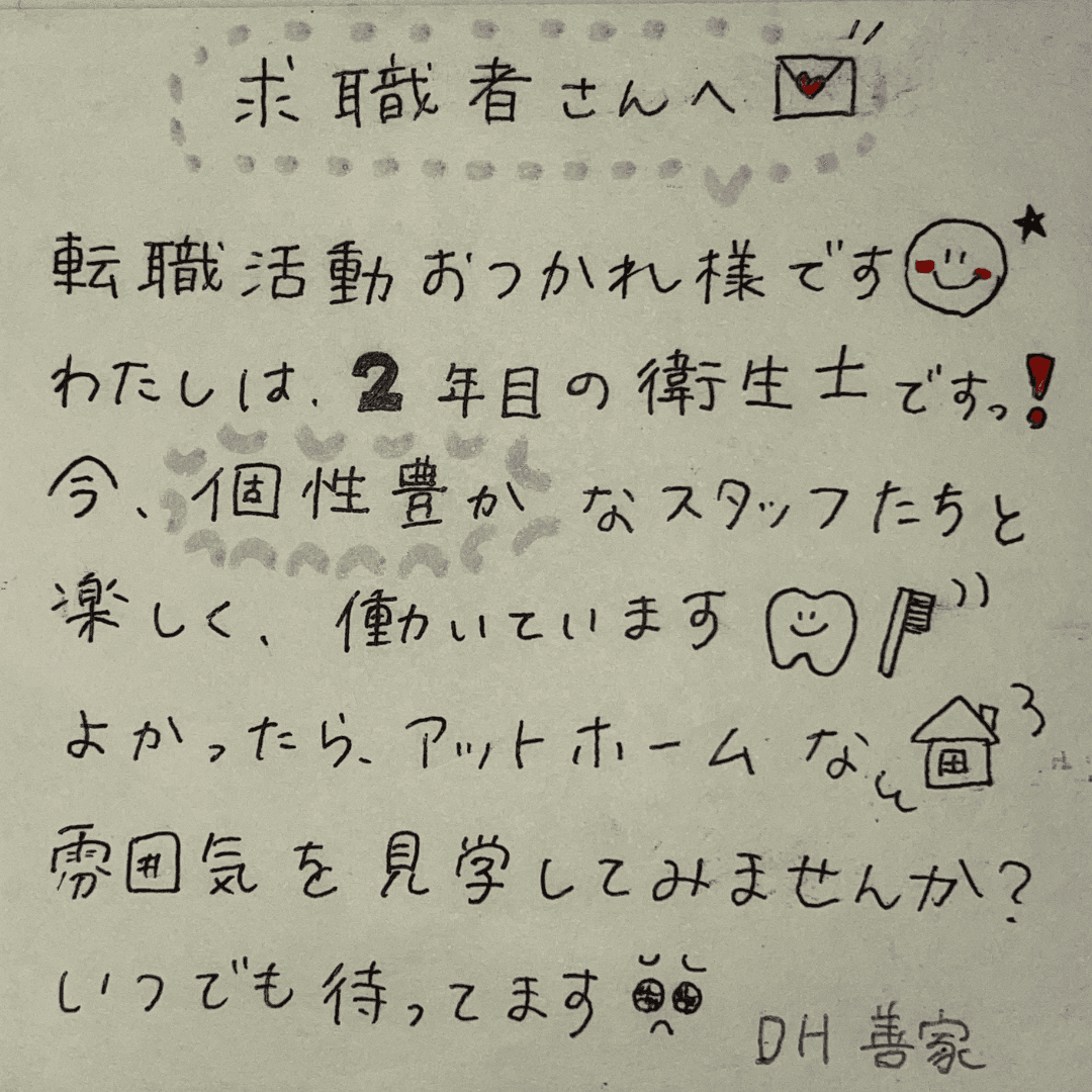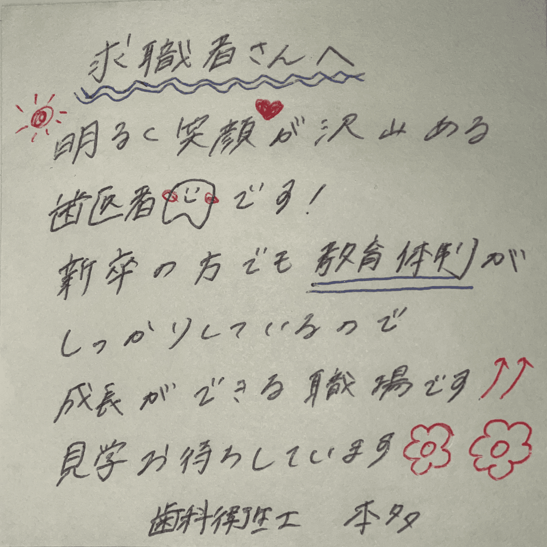 日程をご相談のうえ、ご希望の日程をご案内しております。医院やスタッフの雰囲気を実際に見ていただけたらと思います。個性豊かなスタッフが沢山在籍しているのでぜひお話ししてみてください!持ち物は必要であれば筆記用具をお持ちください。服装は清潔感のあるものであれば私服でも大丈夫です!