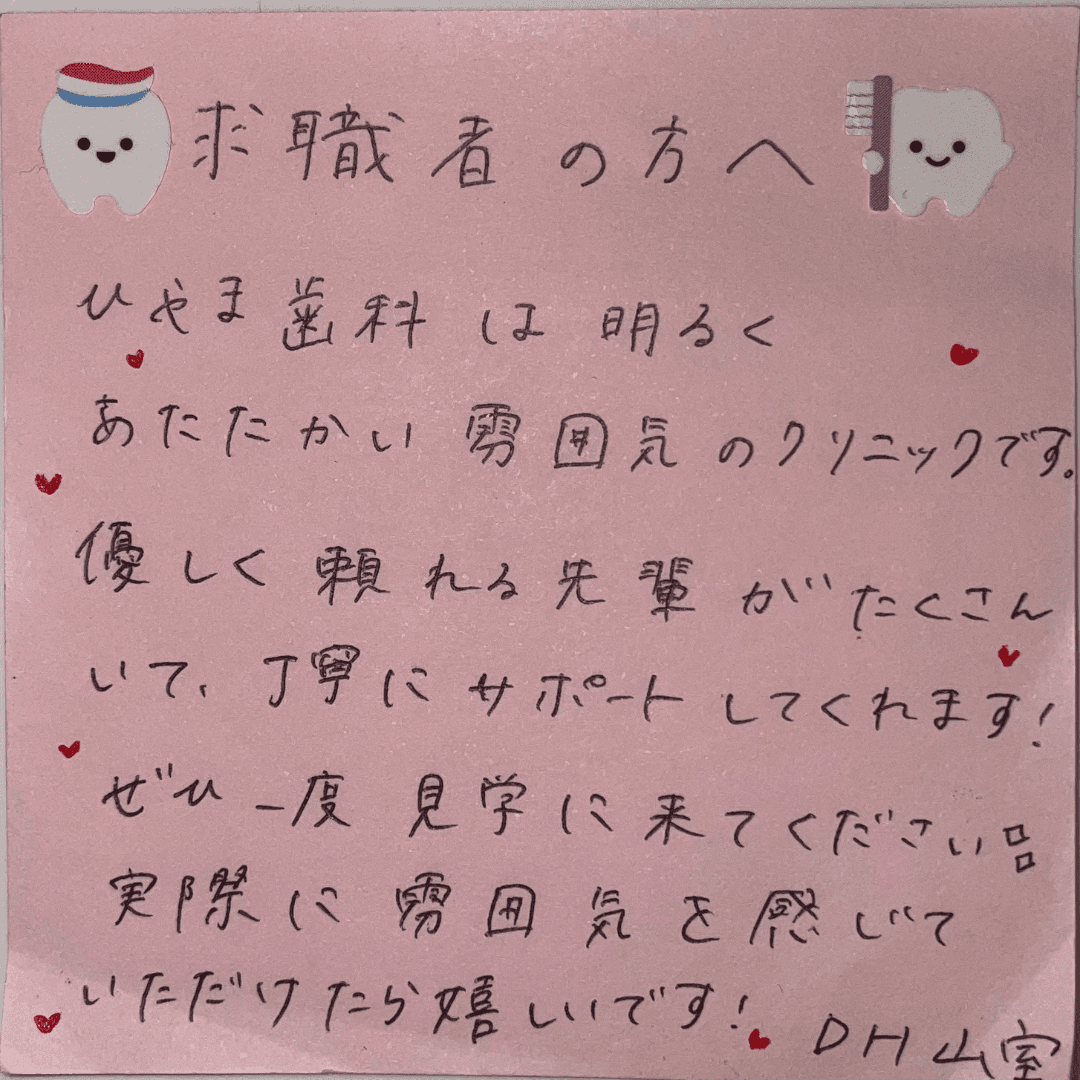 ひやまで働く歯科衛生士一人一人がプロフェッショナルとして強みを発揮し、地域に、会社に、そして家族に貢献できるよう日々努力し続ける事こそ当院の、我々のあるべき姿だと考えています。