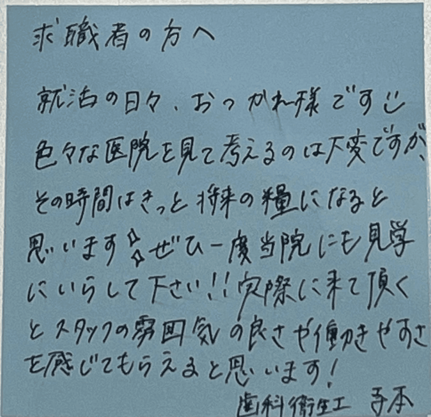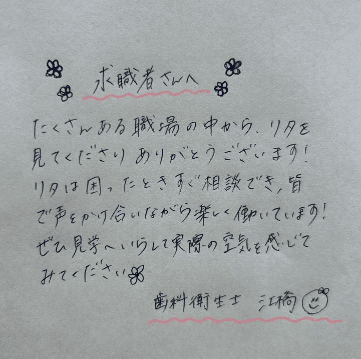 指示された仕事をこなすだけではなく、“専門家としての判断”を尊重し、誇りを持って働ける医院であり続けたいと考えています。
