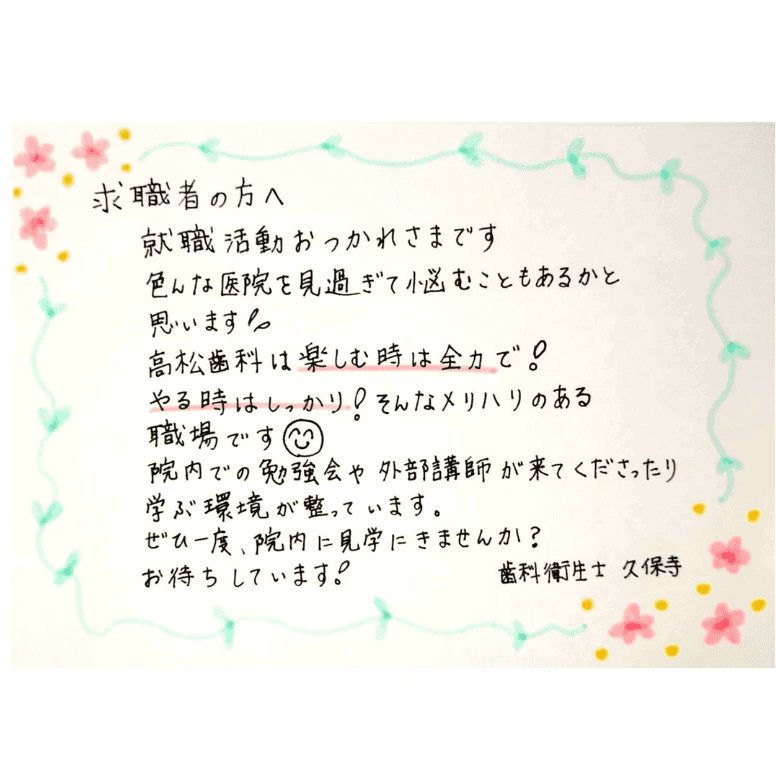 高松歯科医院で楽しく働き人生が豊かになり学ぶことで自信をもち自分を好きになれる場所でありたい。