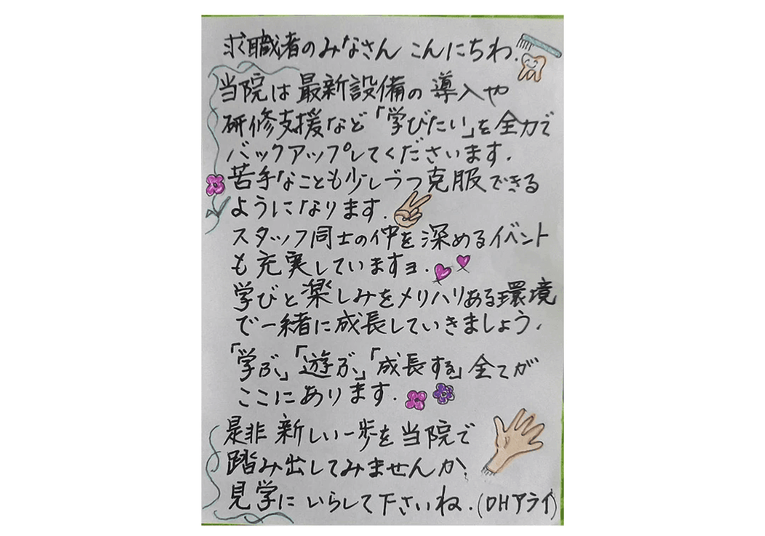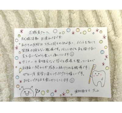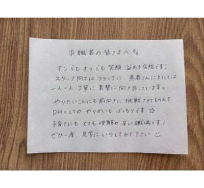 日本一のチームワークを目指すを医院ビジョンに掲げ、思いやりと感謝を軸にした人間関係と社風の医院です。職種や年齢に関係なくお互いを尊重し、困った時は自然に助け合う文化があります。 新人には先輩が丁寧に支え、失敗は成長への学びと考え、責めずに次へ活かす風土です。 意見や挑戦も歓迎され、スタッフの声から新しい取り組みが生まれています。 ミスをしても素直に謝ること、やってもらったことに感謝をすることができる安心して成長できる職場です。